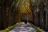 Schöne Straße mit Bäumen auf beiden Seiten, durch die die Sonnenstrahlen der ersten Anzeichen des kommenden Frühlings scheinen. Motoren aus dem Winterschlaf holen und in diesen ersten Sonnenstrahlen Touren zu fahren, ist eine beliebte Beschäftigung. Ein Hauch von Farbe in den Bäumen deutet darauf hin, dass der Frühling kommt.