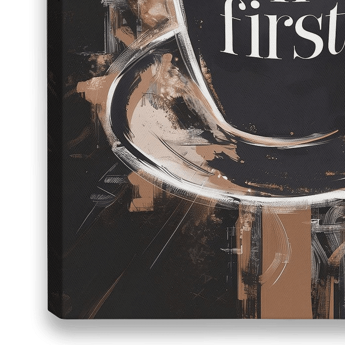 Ein Ölgemälde Stil Plakat mit einer Kaffeetasse und dem Text "Coffee first". Das Gemälde ist in braunen Kaffee Farben.