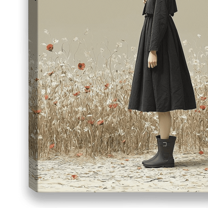 Ein surreales Bild zeigt eine Frau in schwarzem Kleid und Gummistiefeln vor neutralem Hintergrund. Über ihr schwebt ein Meer aus roten Mohnblumen wie ein Regenschirm. Darunter erstreckt sich ein Feld weißer Blumen, durchsetzt mit roten Mohnblumen, das die Komposition verstärkt und eine verträumte, poetische Atmosphäre schafft.