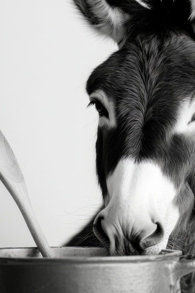 Ein humorvoller Blickfang, der mit seinen großen Ohren und dem neugierigen Ausdruck des Esels jedes Küchenherz erobert. Die Mischung aus Schwarz-Weiß-Kontrast und der typischen Küchenszene bringt Leichtigkeit und Charme in den Raum. Ideal für die kreative Küche, um Gespräche zu starten und das Kochen zu einem Vergnügen zu machen.