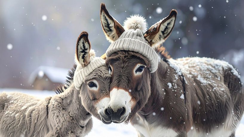 Zwei niedliche Esel, Mutter und Kind, kuscheln in einer verschneiten Landschaft, während Schneeflocken herabrieseln. Sie tragen beide grob gestrickte Mützen mit einem Bommel oben drauf. Dank ihrer Mützen und ihrer Liebe füreinander ist ihnen nicht kalt. Das Bild wurde mit ai erstellt.