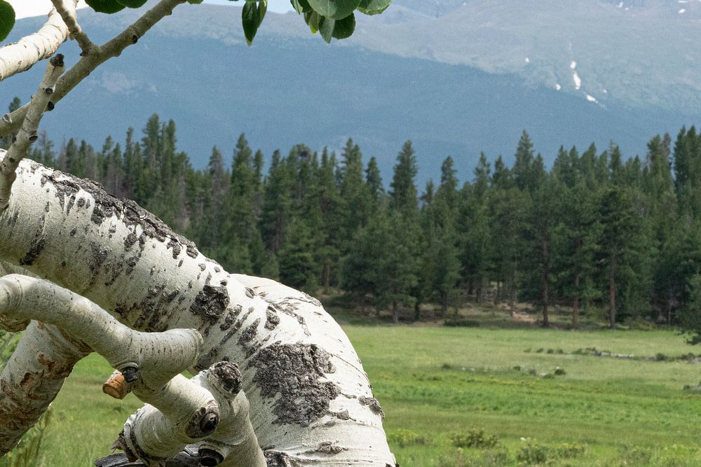 Die Espe hebt sich durch ihre weiße Rinde schön ab. Berge im Hintergrund.
