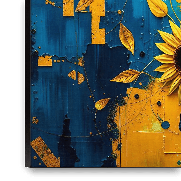Dieses moderne, surreale Kunstwerk fesselt durch seine dynamischen Texturen und Tiefe, geschaffen mit einer kraftvollen Spachteltechnik. Tiefe Blautöne, lebendige Gelbtöne und warme Goldakzente verschmelzen zu einer ausdrucksstarken Komposition, in der sich abstrakte weibliche Figuren und Sonnenblumen organisch aus dem Chaos der Farben…