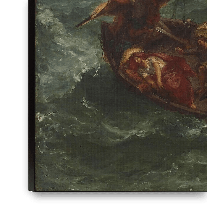 Diese Szene basiert auf einer Begebenheit, die in drei neutestamentlichen Evangelien erzählt wird: Ein wütender Sturm bricht aus, als Jesus und seine Jünger den See Genezareth überqueren, um die Botschaft Christi zu verkünden. Zur Überraschung der Jünger beruhigt Jesus den Wind und den Sturm und dramatisiert so die Stärke des…