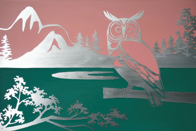 Eine auf einem Ast sitzende Eule blickt über einen stillen Bergsee, umrahmt von Tannenbäumen und sanften Berggipfeln. Klare Formen und klare Flächen schaffen eine minimalistische Atmosphäre, während der rosa Himmel einen schönen Kontrast zum tiefen Grün des Wassers bildet. Silbergraue Linien betonen Federn und Zweige und schaffen so…