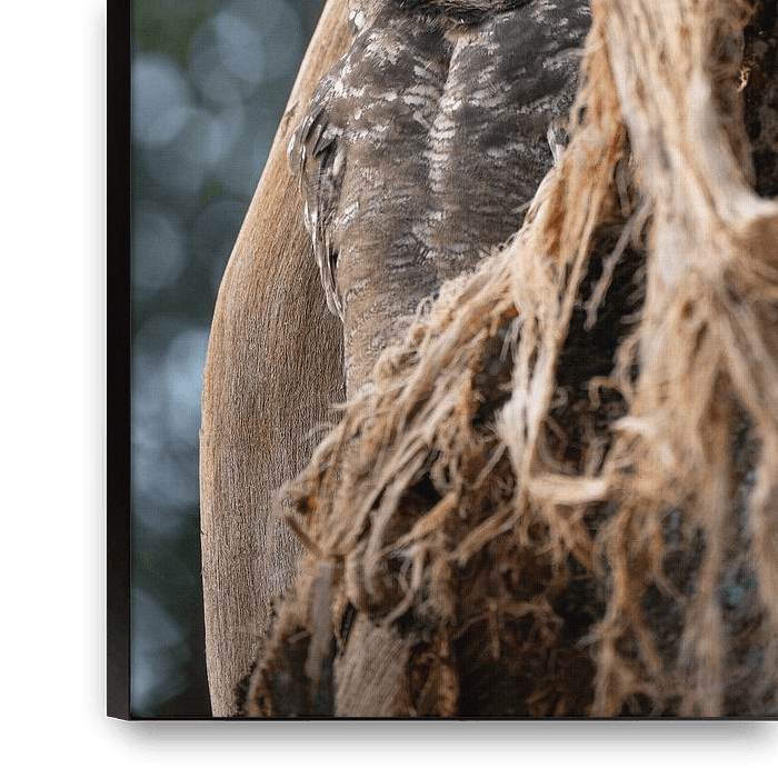 Versteckt in der rauen Rinde eines alten Baumes blickt ein afrikanischer Uhu aufmerksam in die Welt. Seine leuchtend gelben Augen bilden einen starken Kontrast zu seinem weichen, gesprenkelten Gefieder und ziehen sofort die Aufmerksamkeit auf sich. Die natürliche Höhlung und die losen Baumfasern umrahmen das Tier und lassen es fast mit…