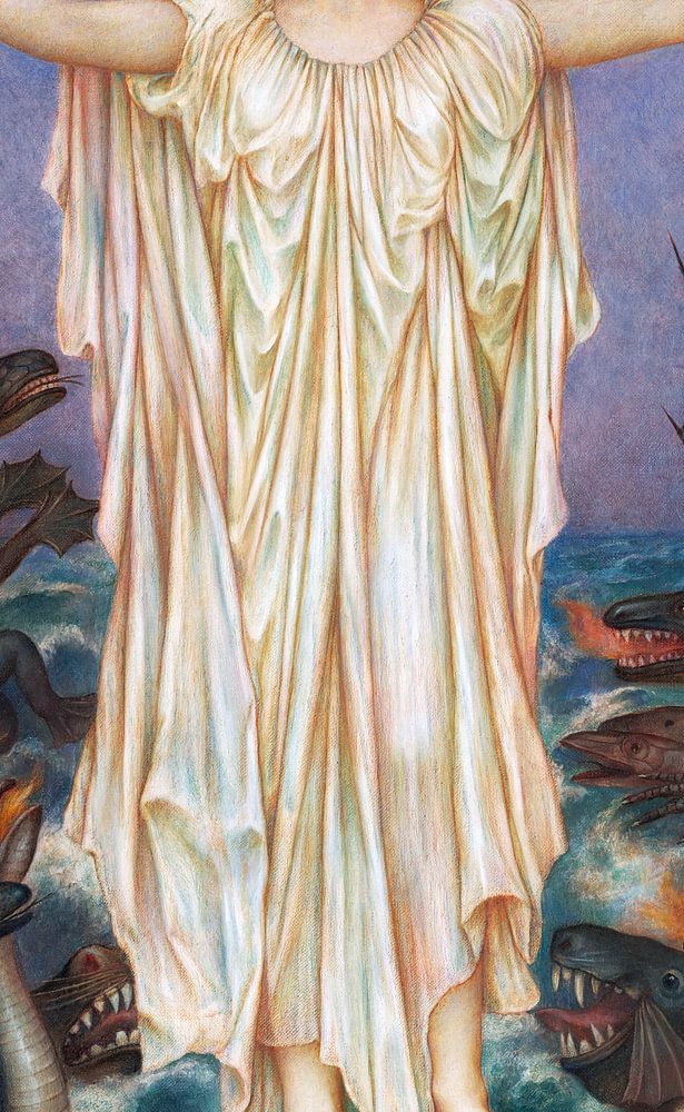 Die einzige weibliche Figur in weißer Robe symbolisiert die Unschuld der Kriegsopfer. Sie steht auf einem einsamen Felsen, die Hände ausgestreckt und die Augen zum Himmel gerichtet, und sucht sowohl physische als auch spirituelle Erlösung von ihrer Notlage, während sie von tosenden Wellen und vielen Seeschlangen belagert wird. Drachen und Meeresungeheuer werden in Evelyns symbolischem Lexikon häufig als Bezeichnung für das Böse und den Tod verwendet. In diesem Gemälde erzeugt Evelyn jedoch einen Hoffnungsschimmer für die letztendliche Rettung durch die Hinzufügung des Regenbogens - symbolisch für das Leben nach dem Tod.
