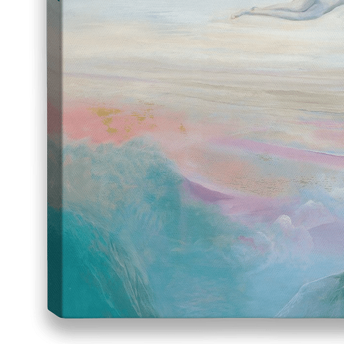 In diesem bezaubernden Gemälde wird eine schwebende Frauenfigur in einer leichten und luftigen Komposition dargestellt, die von zarten Türkis- und Rosatönen durchdrungen ist. Die sanfte Farbpalette verleiht dem Bild eine traumähnliche Atmosphäre, in der die Figur scheinbar schwerelos zu schweben scheint.