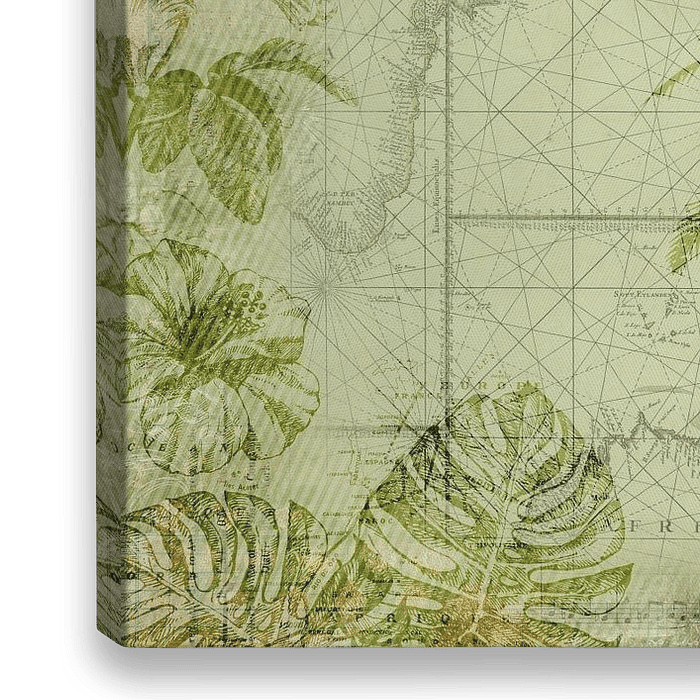 Vintage-Karte und tropische Palme, Monstera Blätter und exotische Vegetation, perfekt für Reisende, Entdecker und Naturliebhaber