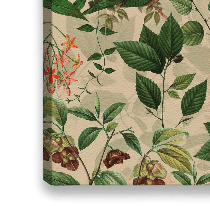 Vintage Muster aus antiken hand gemalten Elementen wie tropischen Vögeln, Zweigen und Ranken mit wunderschönen Blüten auf einem beigem Hintergrund mit Sepia Brauntönung