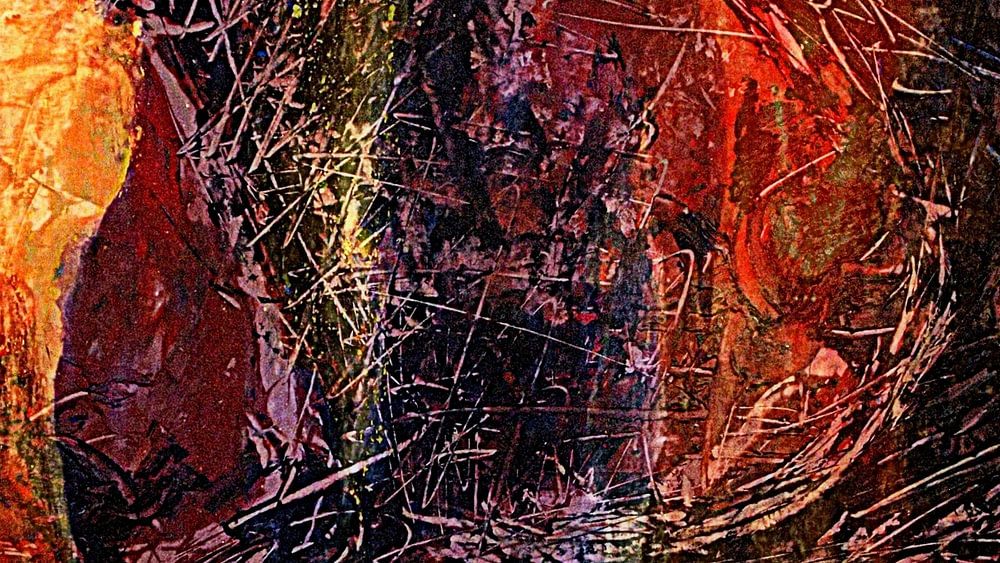 Abstraktes Werk, organische Formen in warmen, dunklen Erdtönen, die aus mehreren Schichten aufgebaut sind.