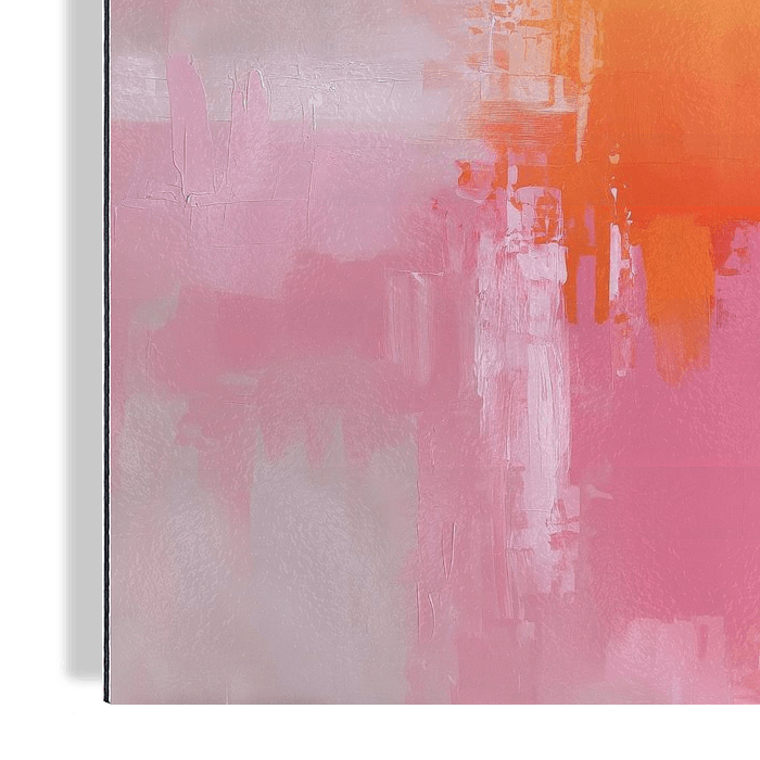 Ein ruhiges abstraktes Kunstwerk, in dem warme Rosa- und Pfirsichtöne in einer weichen, fließenden Komposition aufeinandertreffen. Die ausdrucksstarken Pinselstriche erzeugen eine ätherische Atmosphäre, wobei ein intensives Orange in der Mitte langsam in hellere, verträumte Pastelltöne übergeht. Das Werk strahlt Ruhe und Wärme aus, wie…
