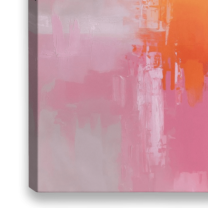 Ein ruhiges abstraktes Kunstwerk, in dem warme Rosa- und Pfirsichtöne in einer weichen, fließenden Komposition aufeinandertreffen. Die ausdrucksstarken Pinselstriche erzeugen eine ätherische Atmosphäre, wobei ein intensives Orange in der Mitte langsam in hellere, verträumte Pastelltöne übergeht. Das Werk strahlt Ruhe und Wärme aus, wie…