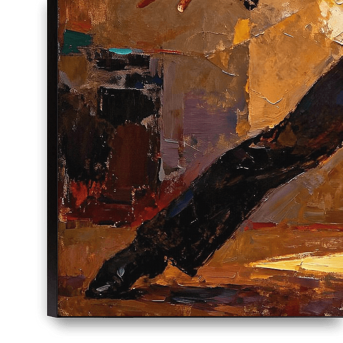Ein Mann wird mitten in einer Bewegung eingefangen, sein Körper schwebt in einer dynamischen Tanzpose, die Fluidität, Kontrolle und stille Kraft ausstrahlt. Jede Kurve seiner Gestalt suggeriert Anmut im Übergang, als würde sich die Bewegung über die Leinwand hinaus fortsetzen. Der Hintergrund entfaltet sich in abstrakten geometrischen…