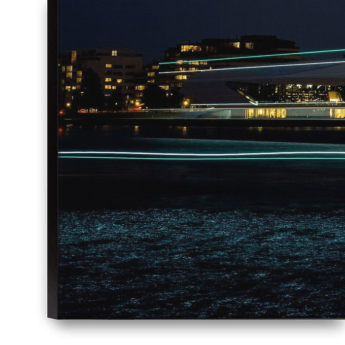Moderne Architektur entlang des IJ, eingefangen im Übergang vom Tag zur Nacht. Die Lichtstreifen folgen den fließenden Formen des Eye Film Museums und unterstreichen den dynamischen Charakter der Stadt. Ein kraftvolles Werk für zeitgenössische Innenräume.