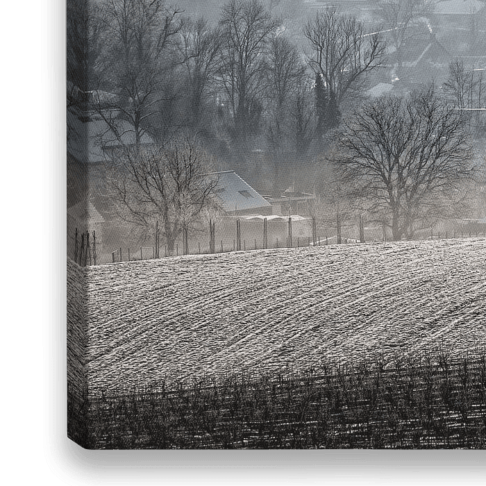 Sonnenaufgang an einem sonnigen, aber nebligen Wintertag im südlimburgischen Dorf Eys, gesehen von den Hängen des Eyserbos-Waldes.