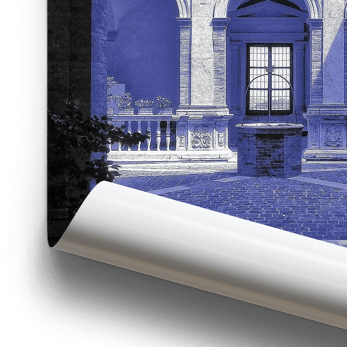 Treten Sie ein in eine Welt, in der Geschichte auf Kunst trifft. Dieses faszinierende Kunstwerk rahmt meisterhaft einen sonnenbeschienenen Renaissance-Hof durch einen imposanten Bogen ein und lädt den Betrachter ein, die heitere Schönheit der klassischen Architektur zu erleben.…