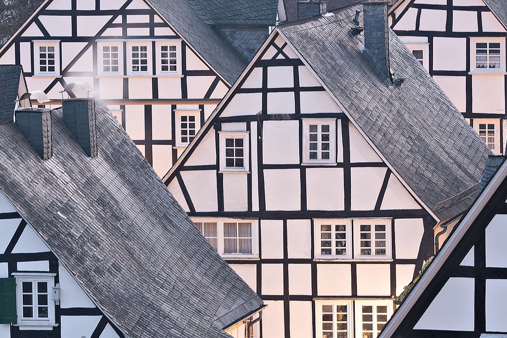 Detail der Architektur des 17. Jahrhunderts mit Fachwerkhäusern in den Farben Schwarzweiss mit rauchenden Schloten und den Lichtern an am frühen Abend in Alter Flecken, das Stadtzentrum von Freundenberg, eine Stadt nah an Winterberg in Nordrhein-Westfalen, Deutschland .