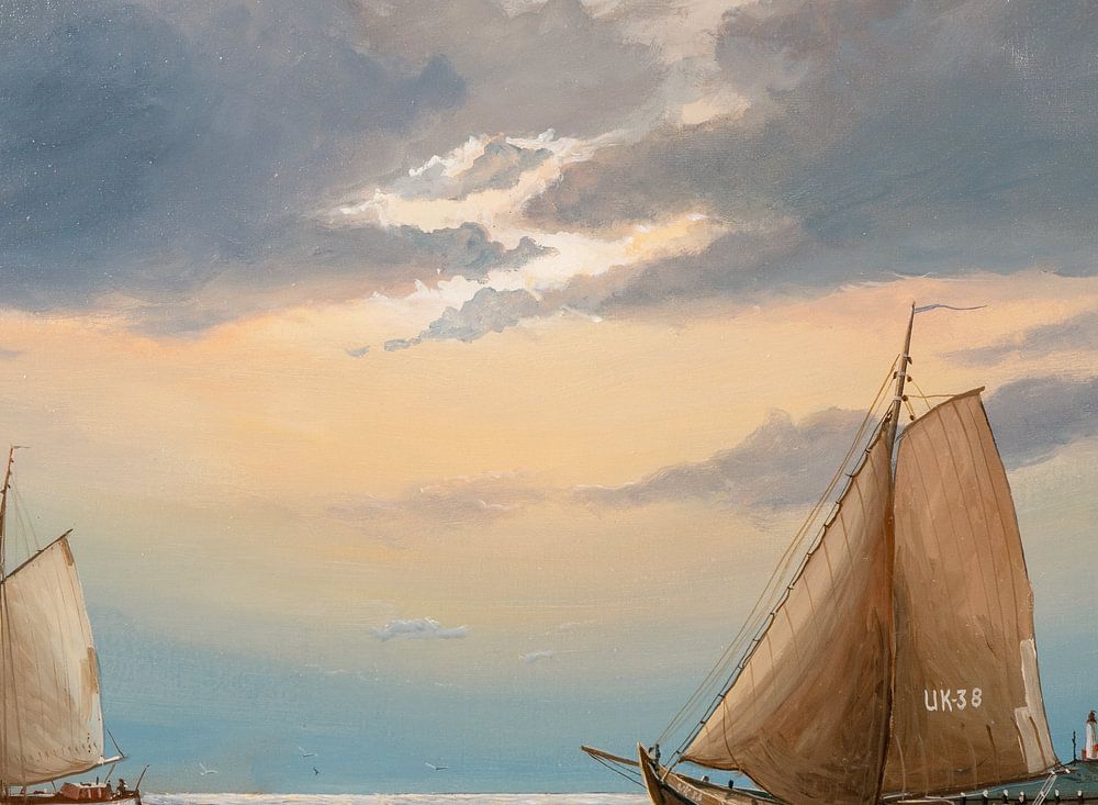 Dies ist ein warmes, realistisches Gemälde eines Urk Botters und einer Tjalk auf der Zuiderzee (dem IJsselmeer) in den Niederlanden. Botter sind historische Schiffe, die für die Fischerei verwendet werden. Der Maler Teun lebt selbst auf Urk und ist seit vielen Jahren Skipper, so dass er mit dem offenen Meer vertraut ist. Es ist ein Bild der altmodischen Fischerei, die heute bedroht ist. Es vermittelt ein Gefühl von Nostalgie. Dahinter ist die Insel Urk mit einem wunderschönen Sonnenuntergang zu sehen. Die Wellen und Möwen über dem Wasser erwecken das Bild zum Leben.
