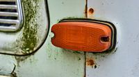 Nahaufnahme eines Fahrtrichtungsanzeigers, orangefarbener Blinker eines alten Trabant-Wagens. Die Trabis wurden in der ehemaligen DDR hergestellt. Das Auto wird trotz seiner schlechten Leistung und Verarbeitung als eine Ikone angesehen.