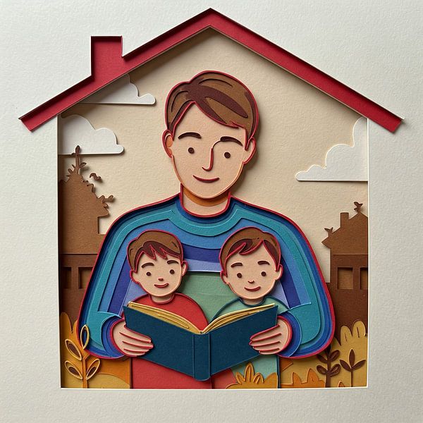 Geschichtetes Scherenschnitt-Kunstwerk, das ein Elternteil mit zwei Kindern innerhalb einer Hausform zeigt. Symbol für Sicherheit, Liebe und Einigkeit.