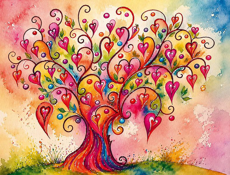 Dieser leuchtende Aquarellbaum ist ein kraftvolles Symbol für Liebe, Lebensfreude und innere Verbundenheit. Seine geschwungenen, verspielten Äste entfalten sich wie tanzende Bewegungen des Lebens und tragen unzählige kleine Herzen – jedes einzelne ein Ausdruck von Gefühl, Wärme und Herzensenergie.