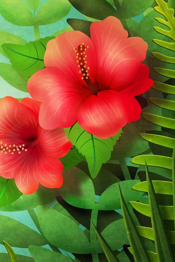 Sie wissen vielleicht, dass ich auf Mallorca lebe. Aber so schön die mediterrane Natur auch ist, sie hat nicht die Reichhaltigkeit einer tropischen Vegetation. Ich liebe es in Farben einzutauchen und deshalb schwelge ich hier in diversen Grüntönen. Natürlich darf ein komplementärer Akzent wie die roten Hibiskus nicht fehlen für ein perfektes Regenwald Gefühl. Zugleich habe ich mit diesem Bild eine neue Technik ausprobiert, denn ich liebe es, mich immer wieder neu zu erfinden. Dieses Kunstwerk entstand ausschließlich durch einfach Formen / Vektoren. Ich habe ganz bewusst den Eindruck erweckt, dass es sich hier nicht um 3dimensionale Pflanzen handelt, sondern um hintereinander geschichtete Ebenen - ähnlich wie man es von "älteren" Theateraufführungen kennt. Es ist eine Kulisse, die eine perfekte Illusion erschafft und ich mag diesen gewollt künstlichen Effekt sehr (ganz ohne künstliche Intelligenz zu benutzen). Wenn auch sie Freude an diesem Fantasie Dschungel haben, dann gefällt ihnen sicher auch der 2. Teil dieses Diptychs. Bleiben Sie bitte weiterhin erdverbunden und ein Liebhaber unserer einmaligen Natur.