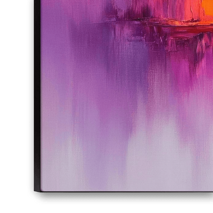 Eine faszinierende Explosion aus lebhaften Lila- und Orangetönen fängt die Magie eines Sonnenuntergangs über einer reflektierenden Wasseroberfläche ein. Diese harmonische Farbkomposition bringt ein Gefühl von Ruhe und Energie, perfekt geeignet für ein modernes Wohnzimmer, wo sie Atmosphäre und Lebensfreude verbreitet.
