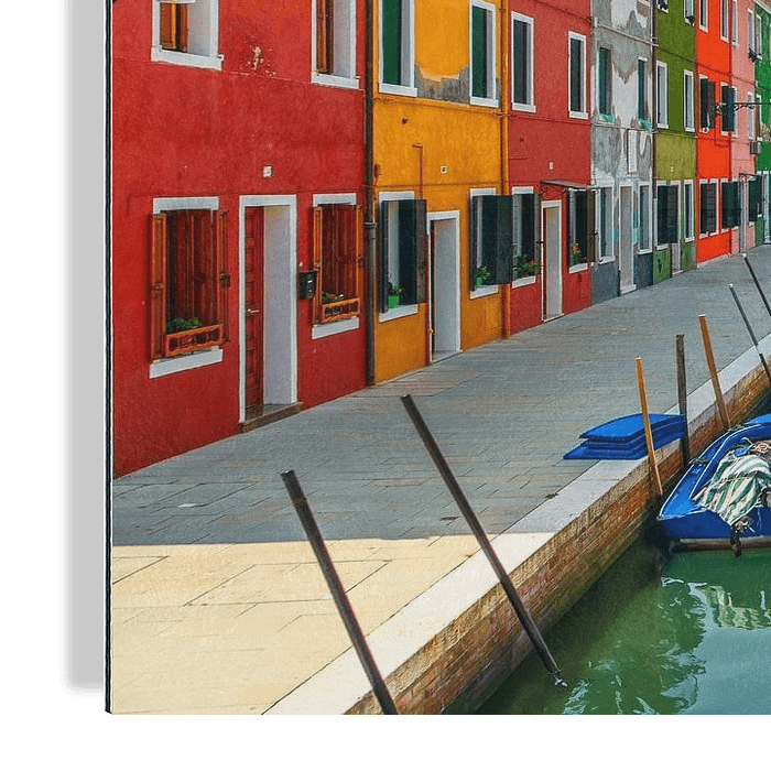 Dieses Foto zeigt einen lebhaften Kanal in der malerischen Stadt Burano, einer kleinen Insel in der venezianischen Lagune, die für ihre bunten Häuser bekannt ist. Jedes Gebäude auf diesem Bild ist in einem anderen, kräftigen Farbton gestrichen, wodurch eine visuell beeindruckende Szene entsteht, die den einzigartigen Charme dieses…