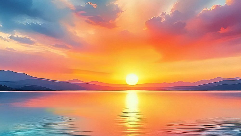 Das Licht der untergehenden Sonne reflektiert sich sanft auf der Oberfläche eines ruhigen Sees, der wie ein Spiegel wirkt und die Schönheit des Himmels widerspiegelt. Kleine Wellen plätschern sanft gegen das Ufer, während die Natur in eine friedliche Stille eintaucht. Vögel ziehen in der Ferne ihre Bahn, und ihre Silhouetten sind vor dem strahlenden Himmel sichtbar, als würden sie den Moment des Tagesabschlusses zelebrieren.
