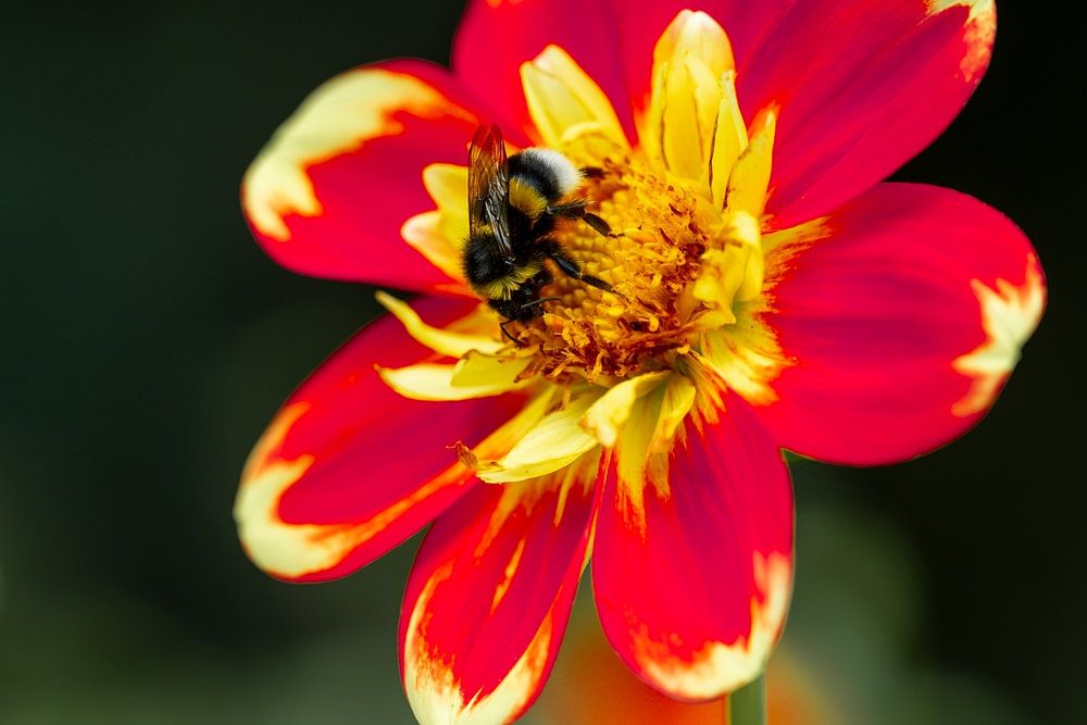 Die leuchtend rote Blüte mit ihren gelben Akzenten wirkt wie ein kleines Feuerwerk der Natur. Im Zentrum ist eine fleißige Hummel zu sehen, die die Blume besucht und so Leben und Bewegung in die Szene bringt. Ein Bild, das Energie, Natürlichkeit und pure Lebensfreude ausstrahlt – perfekt, um jedem Raum Wärme und Dynamik zu verleihen.