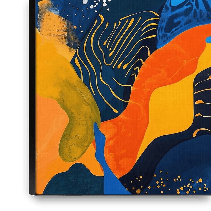 Diese dynamische und lebendige abstrakte Komposition spielt mit kräftigen Farben und organischen Formen, die sich harmonisch über die Leinwand erstrecken. Die intensiven Blautöne treffen auf warme Gelb- und Orangetöne und schaffen eine aufregende Balance, die das Auge fesselt. Die abstrakten Linien und Flächen interagieren spielerisch…
