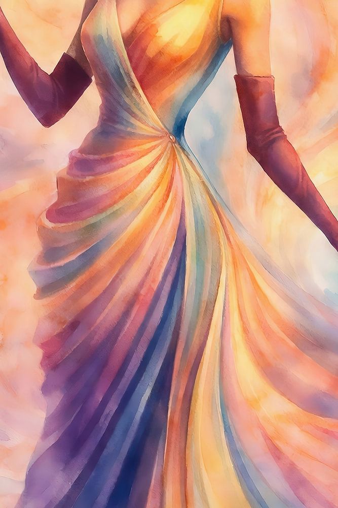 Das Kleid und der Hintergrund sind in einer Explosion von Pastellfarben gemalt, darunter Blau, Violett, Rosa, Gelb und Orange, die in wirbelnden Mustern ineinander übergehen. Die Frau hat…