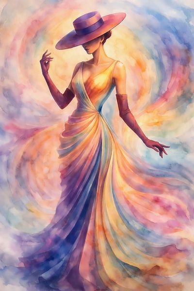 Das Bild zeigt ein Aquarell einer eleganten Frau. Die Frau trägt einen großen Hut und ein langes, fließendes Kleid mit einem tiefen V-Ausschnitt.