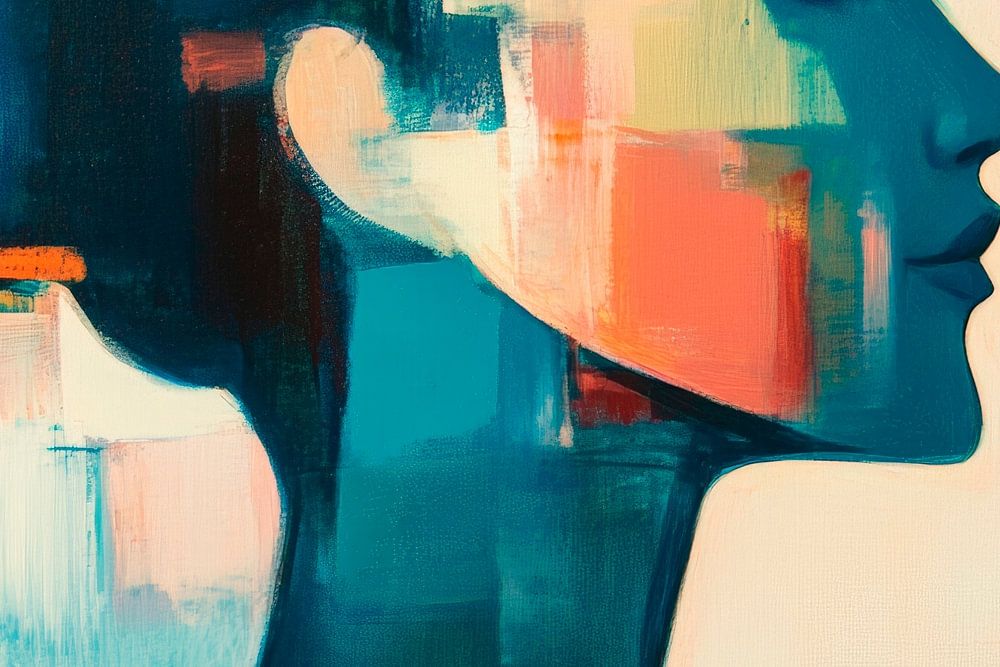 In sanften Tönen von Blau und Orange entfaltet sich das Profil einer mysteriösen Frau, deren kontemplative Ausstrahlung den Betrachter in ihren Bann zieht. Die geometrischen Muster erinnern an eine farbenfrohe Traumwelt. Ideal für ein modernes Wohnzimmer, sondern auch im Schlafzimmer fügt es einen Hauch von künstlerischer Eleganz hinzu.