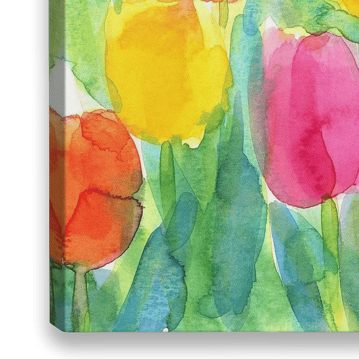 Bestelle dieses Blumen-Wandbild Farbenfroher Frühlingsgarten mit Tulpen Aquarell von Karen Kaspar als Reproduktion auf Leinwand, Alu-Dibond, als Poster, Fototapete oder Acrylglasbild.
