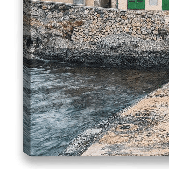 Dieses Bild zeigt eine idyllische Hafenmole an der Ostküste Mallorcas. Der Blick richtet sich auf eine Reihe pittoresker Häuser, deren Türen und Fensterläden in verschiedenen lebhaften Farben gestrichen sind.