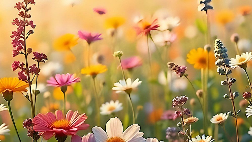 In diesem atemberaubenden Bild entfaltet sich ein lebendiges Farbenmeer aus prächtigen Wildblumen und sanften Gräsern, die harmonisch in einer malerischen Wiese angeordnet sind. Die Wildblumen strahlen in einer Vielzahl von Farben – leuchtendes Gelb, tiefes Violett, strahlendes Rot und sanftes Blau – und schaffen ein faszinierendes Zusammenspiel, das die Sinne anspricht. Die Blumenblüten sind in verschiedenen Formen und Größen gestaltet, von zarten, filigranen Blüten bis hin zu robusten, kraftvollen Pflanzen, die sich im sanften Wind wiegen.