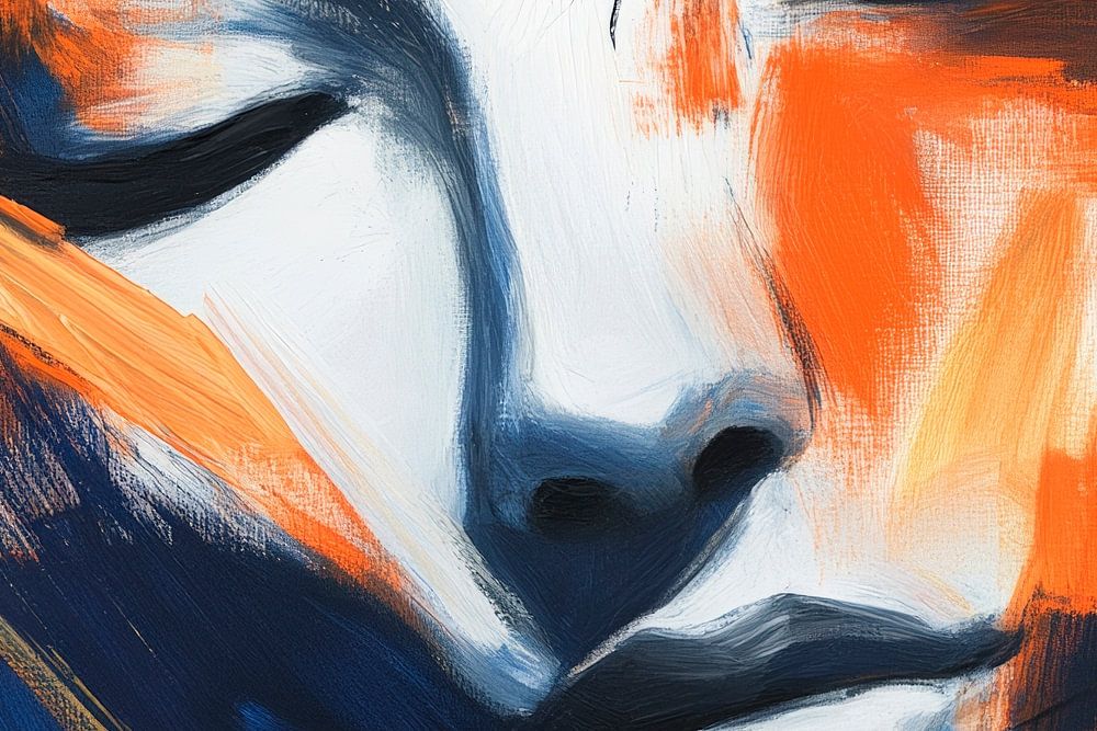 Ein Meisterwerk aus lebendigen Farben und kraftvollen Pinselstrichen erweckt emotionale Tiefe. Die stilisierte, ruhige face strahlt eine beeindruckende Harmonie von Blau- und Orangetönen aus und zieht alle Blicke auf sich. Ideal für das Wohnzimmer, lädt es zu inspirierenden Gesprächen und bringt kreative Energie in jeden Raum.