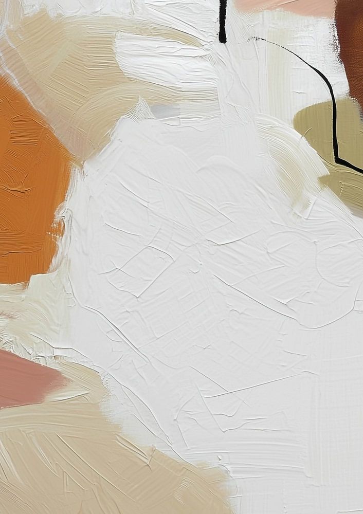 Abstrakte Komposition, in der sich große Farbflächen und subtile Farbstrukturen zu einem spannenden Ganzen verbinden. Warme Töne wie Orange, Beige und Braun werden mit zarten Rosa- und Lila-Nuancen kombiniert, die Harmonie und Kontrast zugleich hervorrufen. Die große weiße Fläche in der Mitte dient als Ruhepunkt und gibt der Komposition Raum zum Atmen.