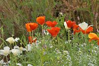 Wildblumenfeld mit den roten Schlafmützen oder dem kalifornischen Mohn darin. Diese Farbe springt aus dem Blumenfeld über den kleinen weißen Blüten heraus. Es ist schön, dieses Bild voller Farben zu sehen.