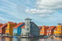 Bunte farbige Häuser auf dem Wasser im Groningen-Wohn-Reitdiephaven.