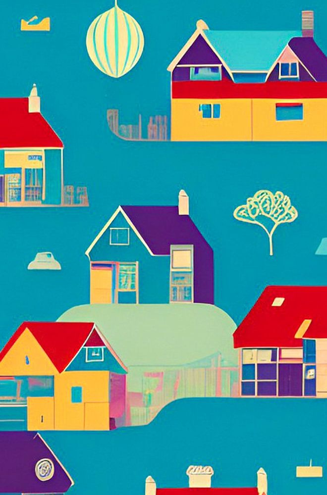 Illustration aller Arten von bunten Häusern - groß, klein, rot, gelb, blau, alles. Schön für das Kinderzimmer.