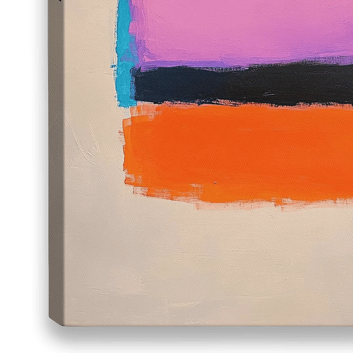 Eine minimale und geheimnisvolle Malerei mit Farbfeldern, eine abstrakte Form. Der Hintergrund ist hellrosa, und das Hauptmotiv ist in lila, orange, schwarz und blauen Tönen gehalten, die einen Kontrast und ein Gleichgewicht zwischen negativem Raum und positiver Form schaffen.