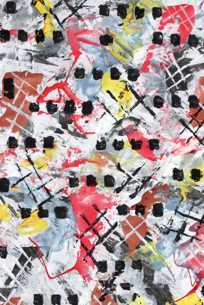 Rote, braune und gelbe Farbtupfer verteilen sich über ein schwarz-weißes Farbengewirr. Darauf sind schwarz-weiße Quadrate gesetzt, die mit Gitterlinien verbunen sind. (elha)