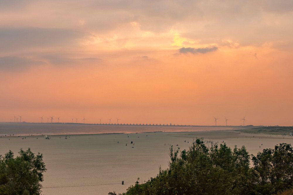 Schöne rosa Himmel am Strand von Vrouwenpolder mit der Oosterscheldekering im Hintergrund