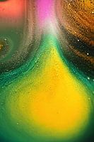 Dieses Kunstwerk zeigt einen dominanten Farbkegel in strahlendem Gelb mit mehreren Grüntönen, der dynamisch aus der Bildmitte aufragt – wie ein leuchtender Vulkan aus Farbe. Außenrum umhüllen Braun-, Rosa- und Orange-Nuancen das Zentrum in weichen, ineinander überblendeten Schichten, während ein feiner Glitzereffekt oder Schimmer die…