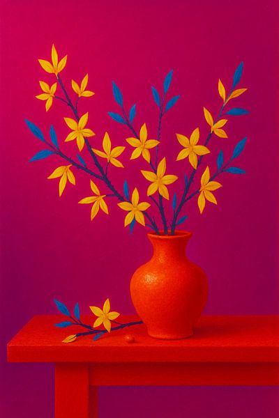 Ein ausdrucksstarkes, energiegeladenes Stillleben, in dem sich eine bunte Vase und leuchtende Blütenzweige zu einem lebendigen Ganzen verbinden. Die kräftigen Farbtöne - von tiefem Rosa über warmes Gelb bis hin zu leuchtendem Rot - sorgen für Dynamik ohne Aufregung. Die Komposition bleibt raffiniert und anmutig und macht dieses Kunstwerk zu einem echten Blickfang in modernen und kreativen Innenräumen. Eine Ode an Farbe, Licht und Bewegung an der Wand.