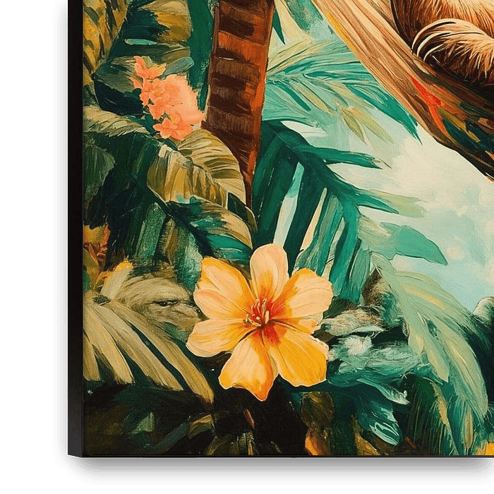 Bestelle dieses Blumen-Wandbild Fauler Faultier im bunten Dschungel von Poster Art Shop als Reproduktion auf Leinwand, Alu-Dibond, als Poster, Fototapete oder Acrylglasbild.