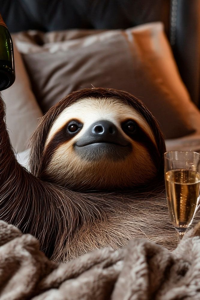In einer luxuriösen Kuscheloase, umgeben von weichen Decken, erhebt ein gemütlicher Faultier seinen Champagner zum feierlichen Toast. Glitzernde Kristallleuchter reflektieren sanftes Licht auf der opulenten Bettwäsche. Diese Szene strahlt eine entspannte Feiertagsatmosphäre aus, in der sogar das Faultier einen Hauch von Eleganz genießt. Pure Gemütlichkeit verbindet sich hier mit einer Prise Glamour.